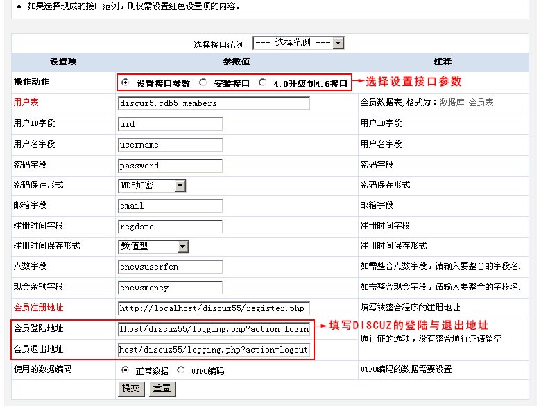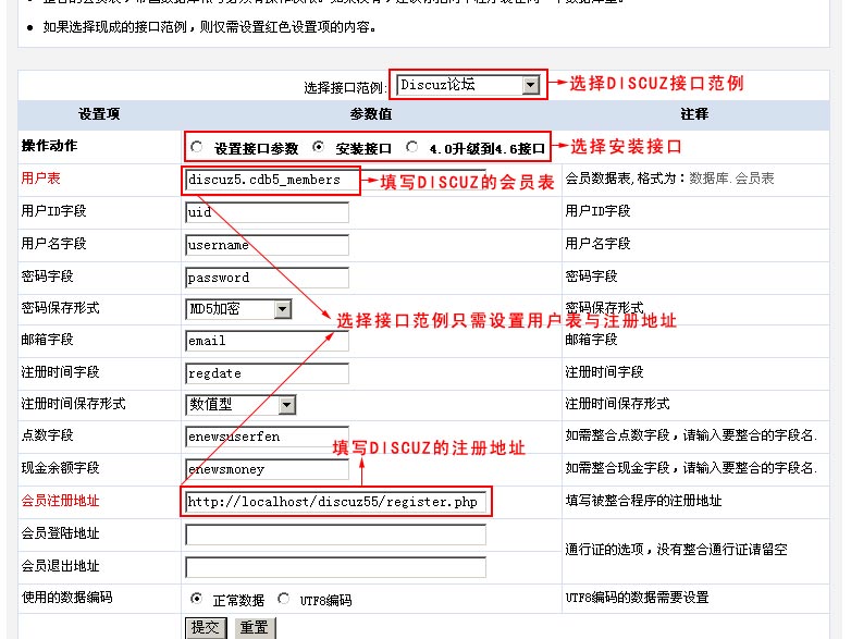 因為DISCUZ有現成范例,所以我們直接選擇接口范例的“Discuz論壇”,選擇后只需設置用戶表與會員注冊地址,然后點擊提交即可。