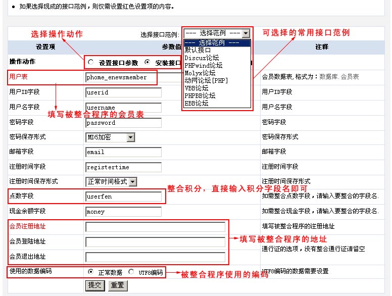 如果要整合積分直接設置萬能會員接口:把“點數字段”改為相應的積分字段名即可。