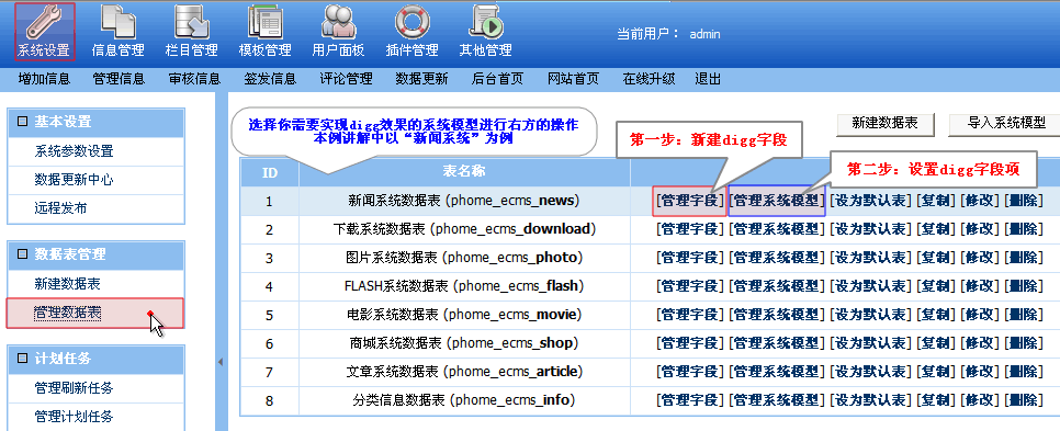 三步教你學會digg 操作步驟: 一、 digg字段創建、設置 登陸后臺--->“系統設置”--->“管理數據表”,進入如下圖(圖2):
