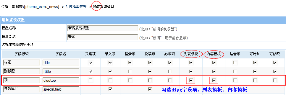 選擇你需要實現digg效果的系統模型,進行右方的操作,本例中以在“新聞系統模型”中實現digg為例;