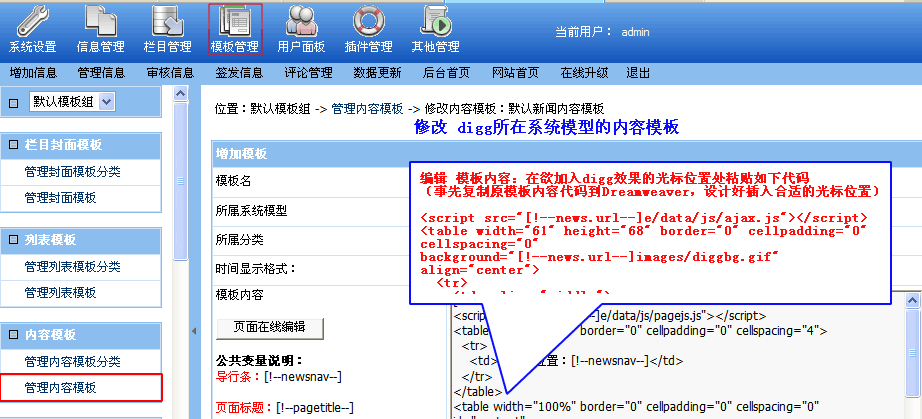 二、 修改digg所在系統模型的內容模板 點擊菜單“模板管理” --->“管理內容模板” --->點擊右側digg所在系統模型“修改” (圖5):