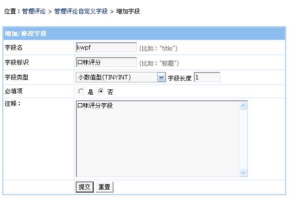 (1)、后臺>"評論管理">"自定義評論字段">"增加字段",進入如下界面增加字段: