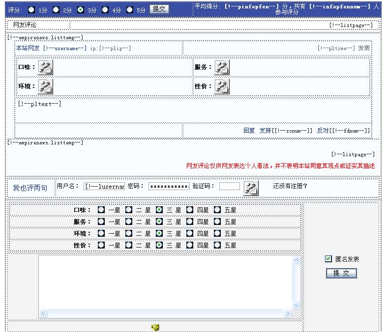 首先后臺增加評論字段,然后修改評論模板即可:評論表單元素可任意,只需變量“name=字段名”,顯示評論字段內容用“[!--字段名--]”。