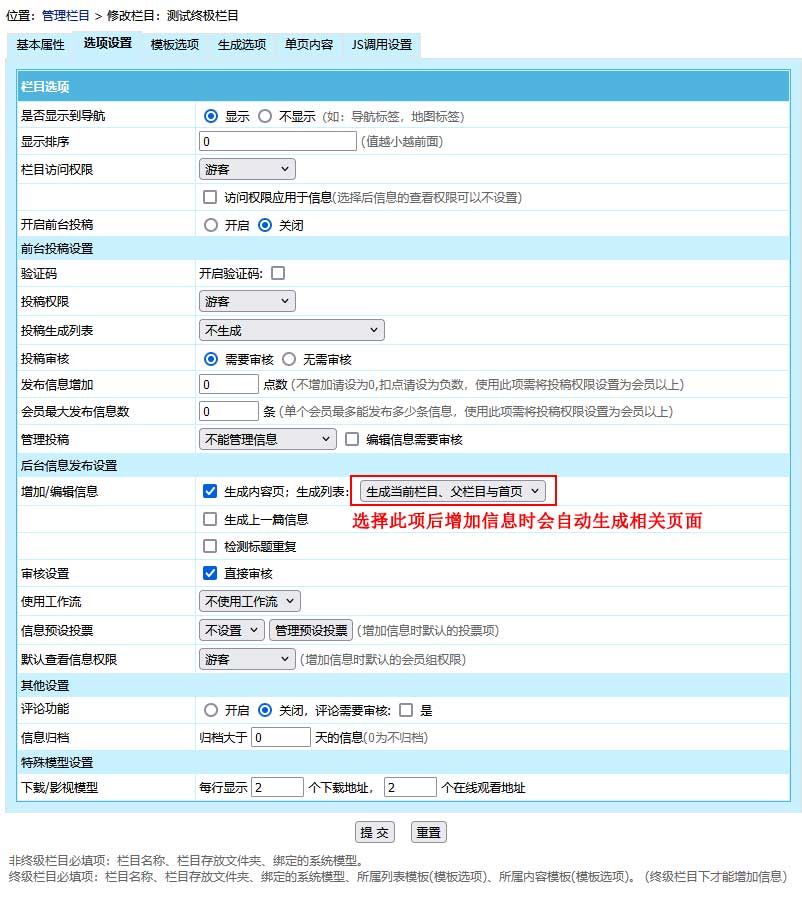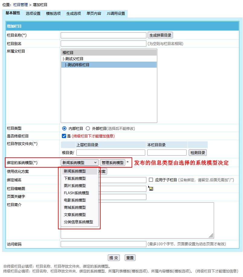三、增加信息頁(yè)面發(fā)布的信息類型由欄目綁定的系統(tǒng)模型決定: