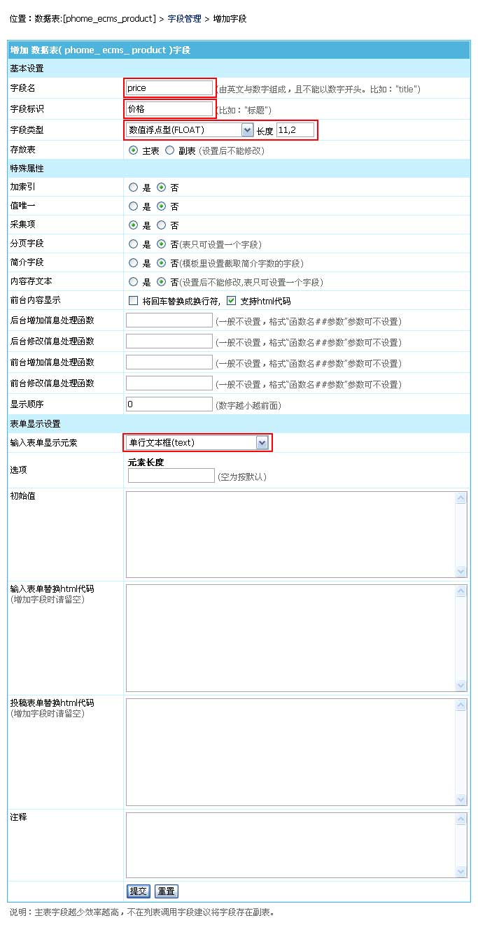 | (三)、增加字段:由于產(chǎn)品名稱與產(chǎn)品縮略圖是系統(tǒng)內(nèi)置字段,所以下面我們增加其余字段。 |