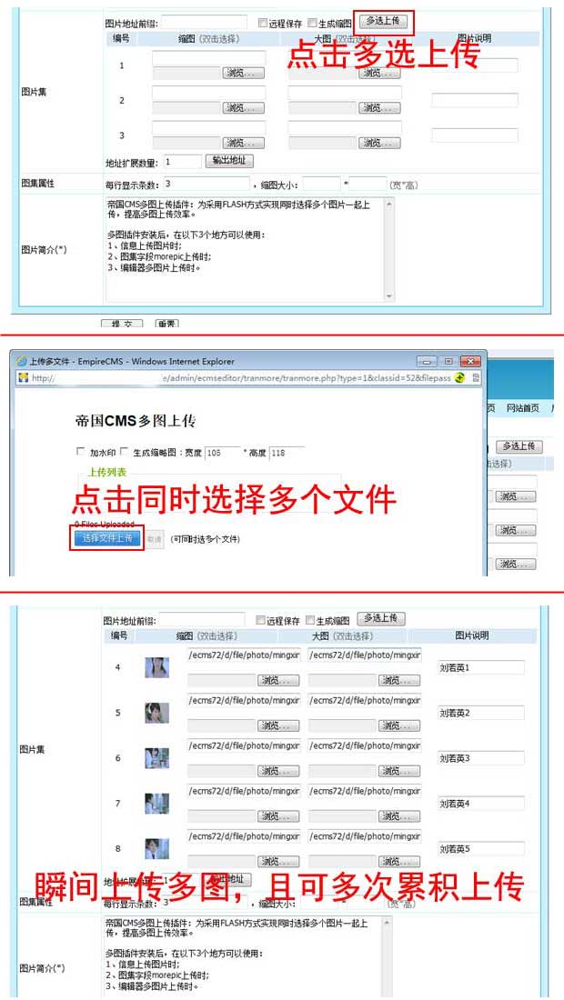 原來上傳多圖文件,需要挨個選擇文件,然后再點批量上傳,比較麻煩。所以帝國CMS7.2新增了多圖上傳插件:為采用FLASH方式實現(xiàn)同時選擇多個圖片一起上傳,提高多圖上傳效率。