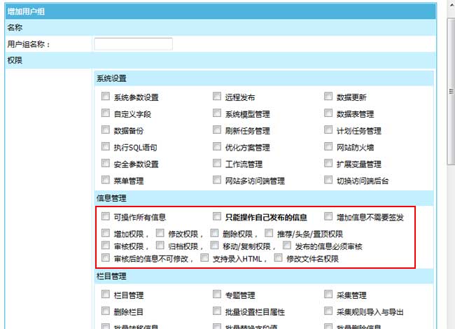 2、用戶組權限新增:刪除欄目權限,從管理欄目權限單獨分離,權限更細分。