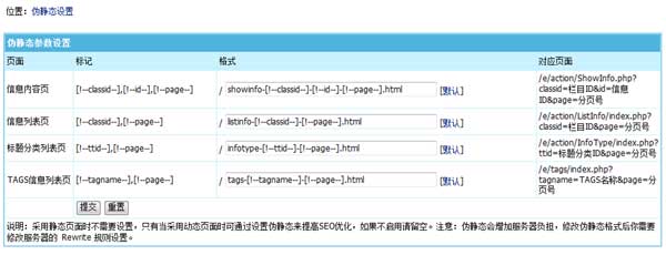 支持設(shè)置信息內(nèi)容頁(yè)、欄目頁(yè)、標(biāo)題分類頁(yè)、TAGS列表頁(yè)及各分頁(yè)偽靜態(tài)設(shè)置。