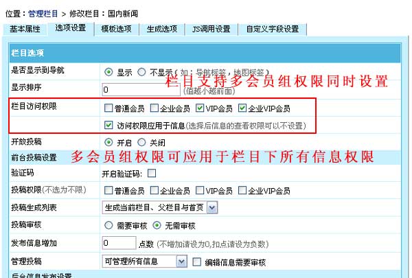 帝國CMS 6.6版欄目頁和信息內容頁訪問權限支持限制多會員組訪問。并且保留原按權限值限制功能,用戶自行選擇,更強大。