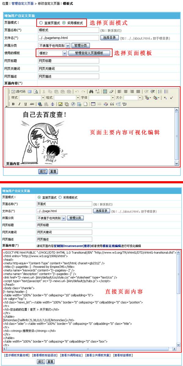 帝國CMS 6.6版自定義頁面支持“直接頁面式”和“采用模板式”兩種模式,制作單頁更方便。