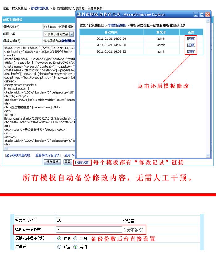 (1)、所有模板都支持自動備份:包括標簽模板、JS模板、列表模板、內容模板、搜索模板、模板變量、封面模板、首頁方案、自定義頁面模板、評論模板、打印模板、投票模板、所有公共模板等都支持模板自動備份。