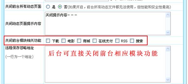 帝國CMS 6.6版新增關(guān)閉前臺相關(guān)模塊總開關(guān),支持下載、電影、商城、在線支付、RSS、搜索模塊關(guān)閉設(shè)置。關(guān)閉模塊更方便,不需要刪除相應(yīng)文件。