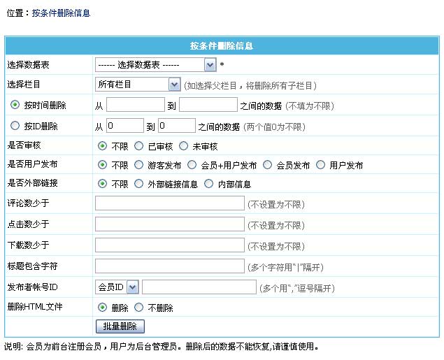 帝國CMS 6.6版批量刪除信息功能增強,清除垃圾信息更方便,新增按以下條件刪除信息: