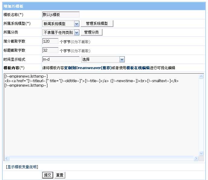 帝國CMS模板調用一直都支持標簽調用與JS調用,先前版本JS調用不支持調用自定義字段,只支持調用title、newstime、writer等固定變量,為了使JS調用更加靈活,V6.0對此功能進行了升級,已經支持調用所有自定義字段,并且支持同ecmsinfo標簽模板一樣的附加變量,更加靈活。截取字數及日期格式直接在模板里設置,不需要修改每個欄目的設置,更方便。
